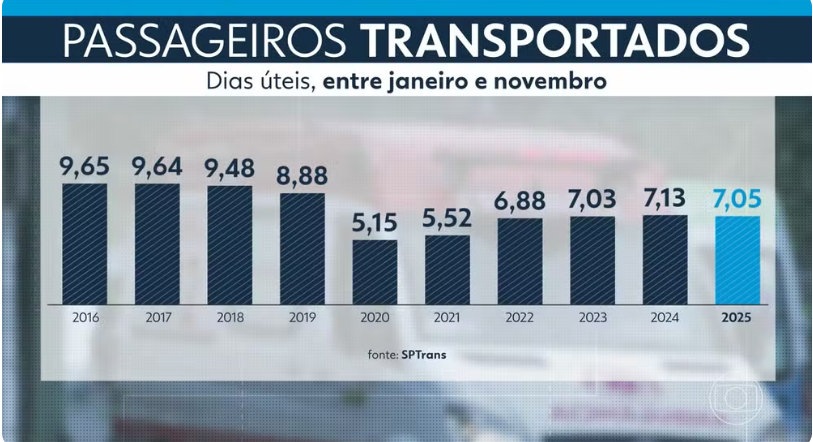 Foram cerca de 7,05 milhões de usuários transportados entre janeiro e novembro do ano passado. Em 2024, foram 7,13 milhões no mesmo período, segundo dados da SPTrans.