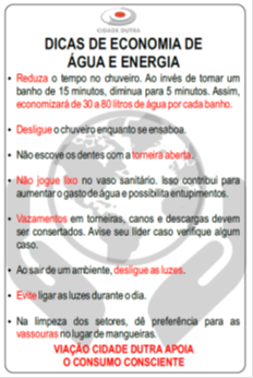 Realizada visando evitar o desperdício e conscientizar sobre a importância da economia de água e luz para os colaboradores da empresa. Foram colocados banners nos setores da manutenção e entregue folder informativo para todos os colaboradores da manutenção e limpeza.